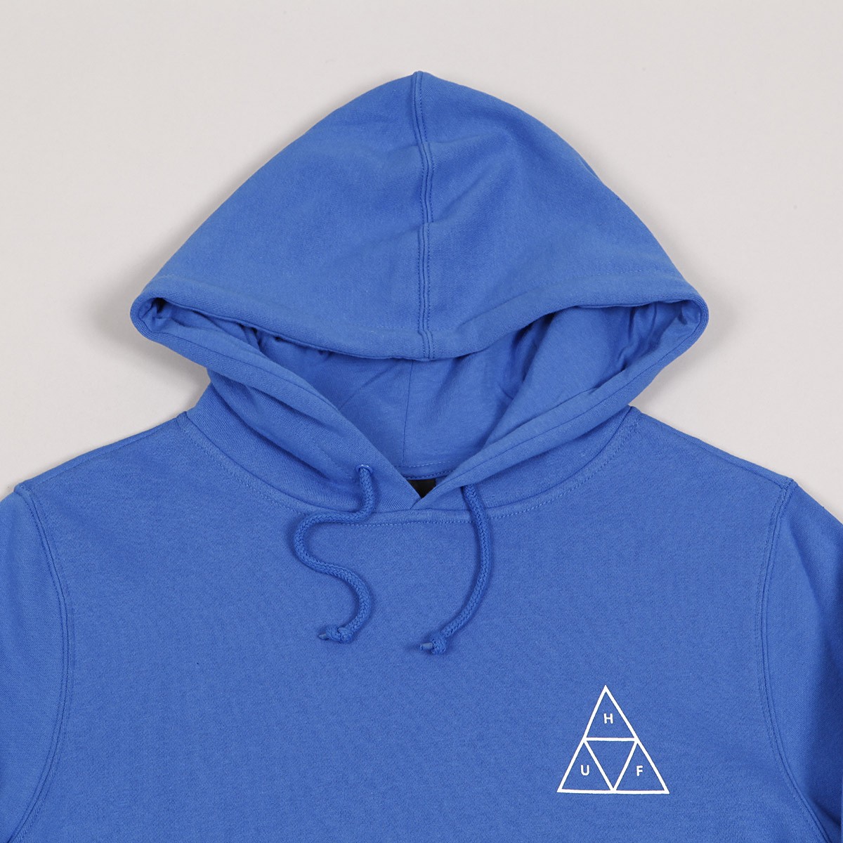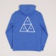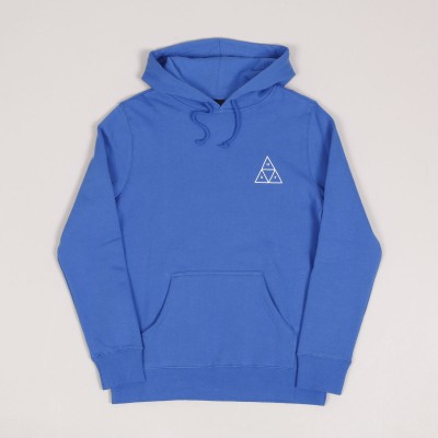 HUF Essentials Triple Triangle sweatshirt in deep blue has a small HUF logo on the chest and a large one on the back. Adjustable hood and large front hand pocket. Material 80% cotton, 20% polyester, fleece lining.