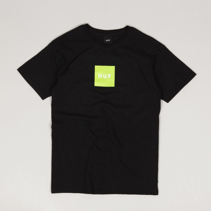 HUF Essentials Box Logo Tee in black . HUF Box Logo print on the chest in contrasting bright green. Small HUF logo patch on the bottom hem. Material 100% cotton.