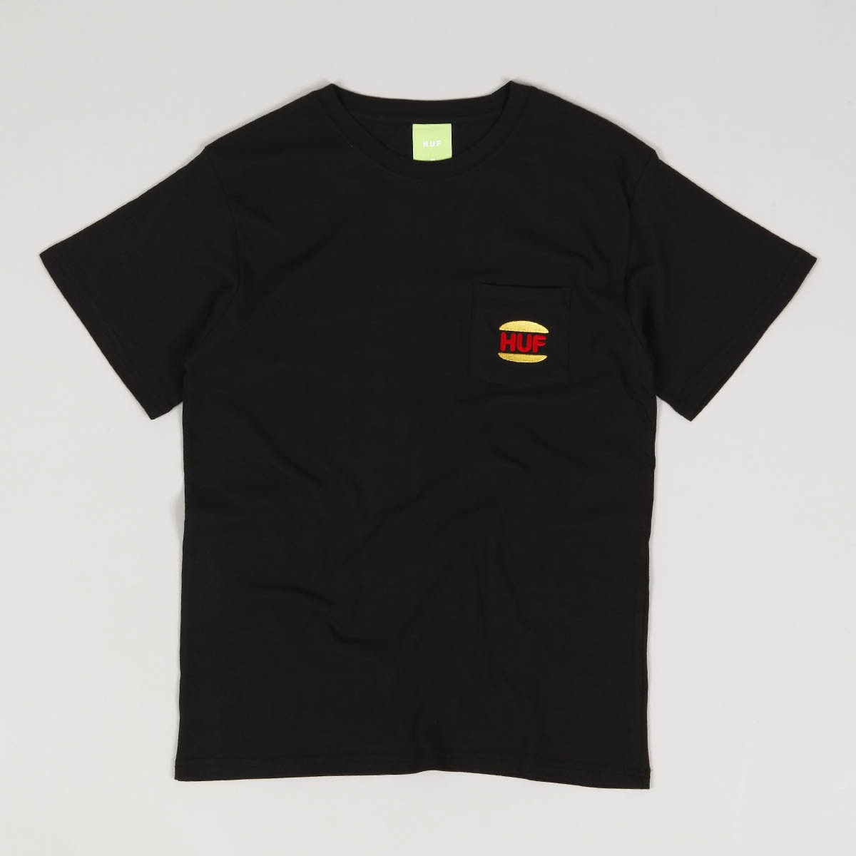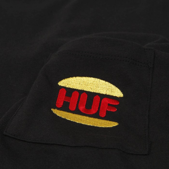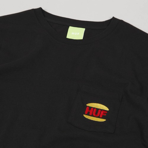 HUF Regal Pocket Tee in black . Small pocket on the left chest for small items. The pocket has a colorful HUF logo embroidered on it . The material is 100% cotton.
