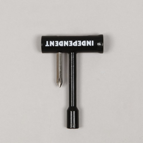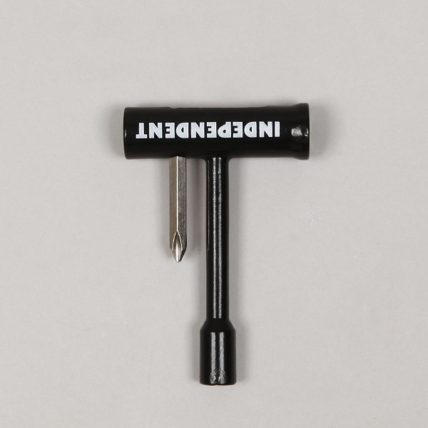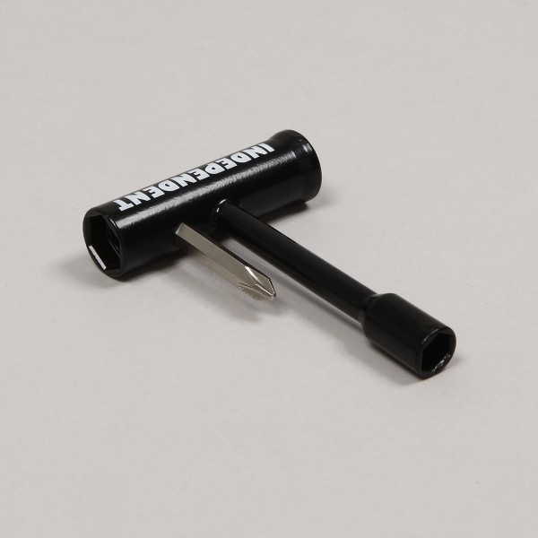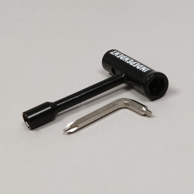Skate tools from the Independent Trucks brand called T-Tool Skate Tools in black with the colorful Independent lettering. All-metal design, includes an Allen and Phillips screwdriver, 10, 13, and 14 millimeter wrenches for tightening nuts.