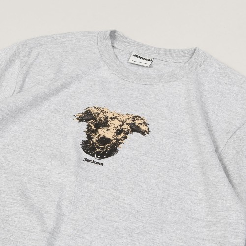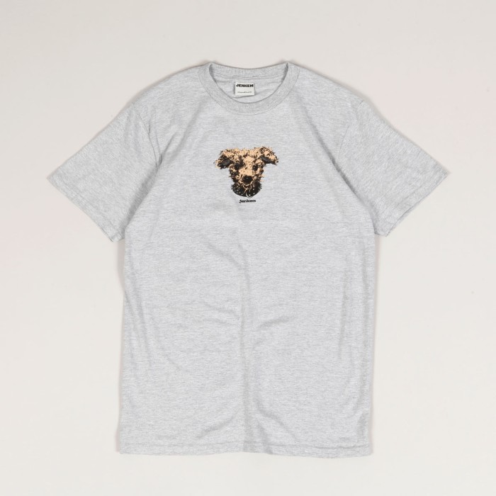 Jenkem Rags Tee in brindle grey. The t-shirt has a round neckline and short sleeves. On the chest there is a dog's head print with the inscription Jenkem below the graphic.