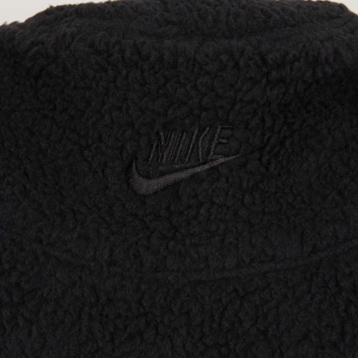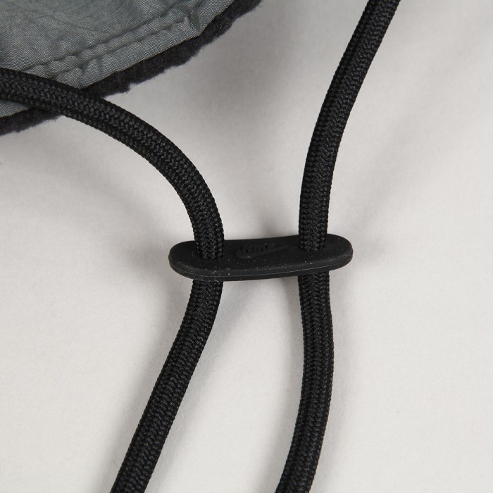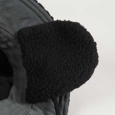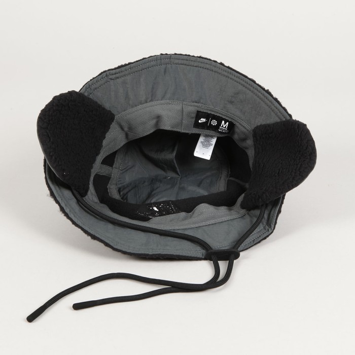 Nike SB Apex Ear Flaps Bucket Hat in Black Iron Grey. Made from soft fleece, it has removable ear flaps, a drawstring and a medium depth. The flaps are snap-fastened to the inside of the hat. When not in use, they can be stored in a hidden pocket on the crown. The thick fleece material is lightweight but extremely warm. The Nike swoosh is embroidered on the forehead.