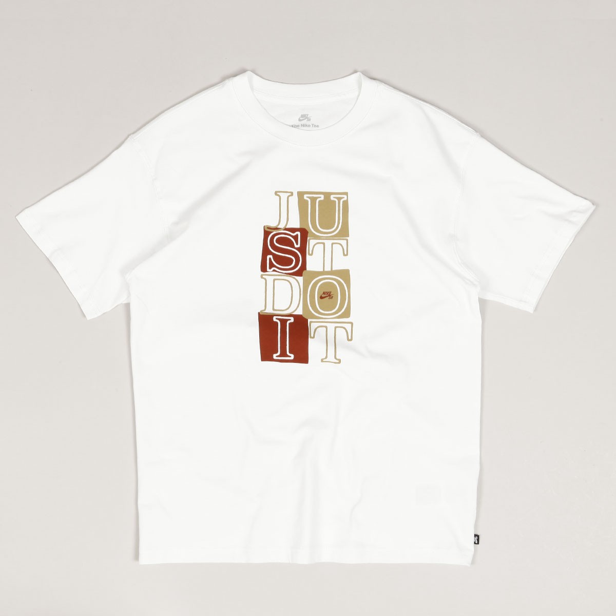 Nike SB Remake JDI T-shirt in white washed color. The design and material are inspired by vintage historical Nike clothing pieces from the last century. It is designed for skateboarding, but also suitable for everyday wear. All-over Just Do It graphic with a small Nike SB logo on the chest. Subtle brand flag on the left side. Material 100% cotton.