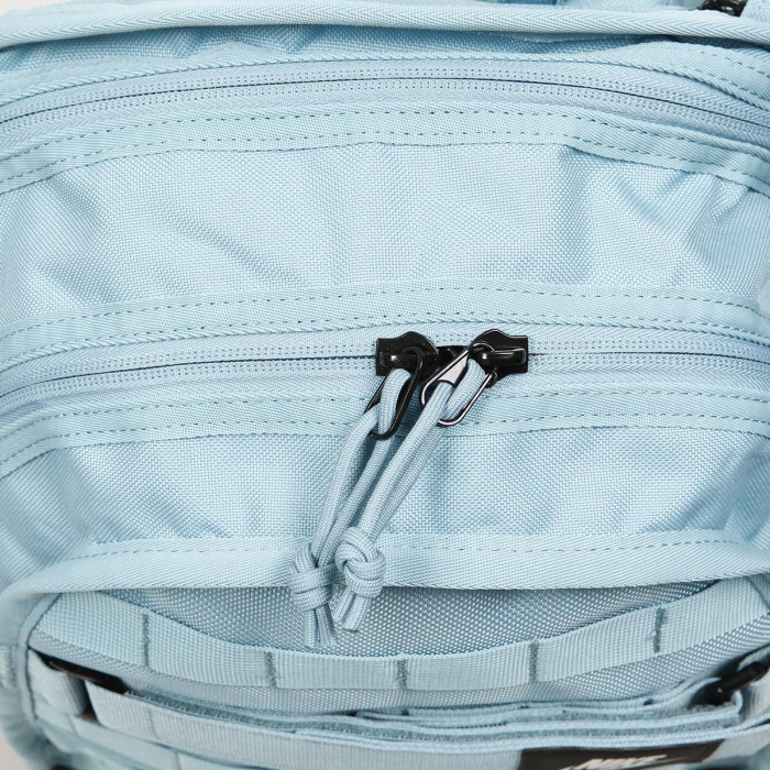 Nike SB backpack , model called RPM has a padded back, a padded laptop pocket, internal pockets for small items. On each side there is a smaller zippered pocket for various small items and a pocket for a bottle. On the front and bottom there are adjustable straps for attaching a skate board. On the top strap there is a white Nike logo. Volume 26 liters. Made of waterproof material.