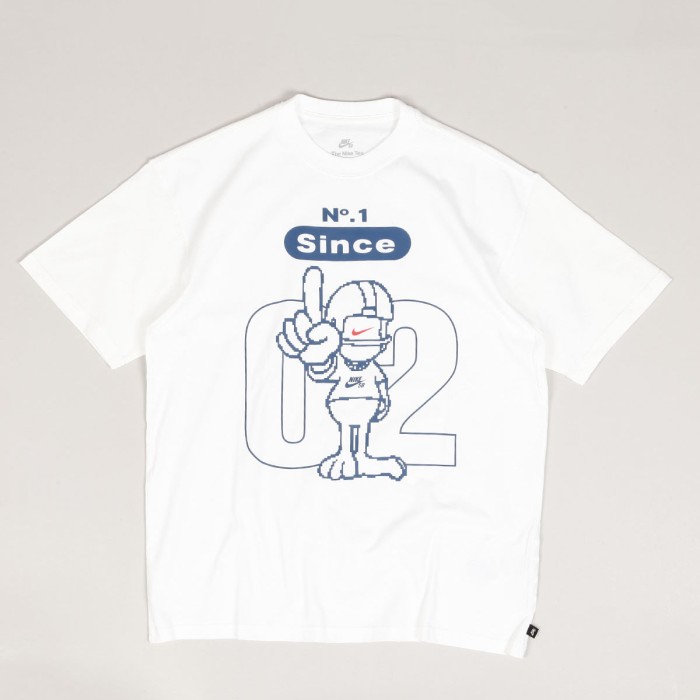 Nike SB T-shirt , model called N.1 Sport Tee in white. It is designed for skateboarding, but also suitable for casual wear. On the chest there is a graphic print with the inscription Number one since 2002 and a contrasting Nike SB pipe . On the left side there is a discreet brand flag. Made of medium-thick cotton, which is both soft and slightly structured. The T-shirt has a LOOSE FIT cut (i.e. it is looser and larger than standard sizes. We recommend moving one size down if you plan to wear the T-shirt more on the body for casual wear.)