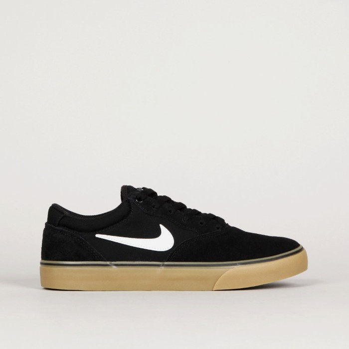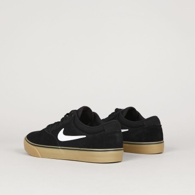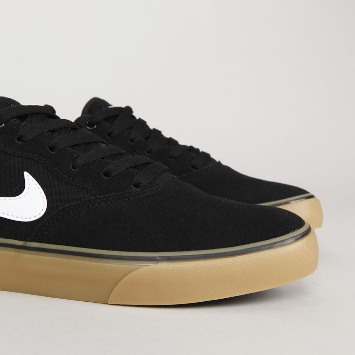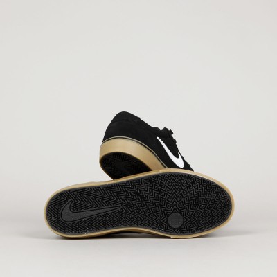 Nike SB Chron 2 skateboarding shoes in Black White Gum. The upper is made of a combination of suede and reinforced canvas. The thin and breathable tongue ensures sufficient airflow. The dual-density Solarsoft foam for impact absorption and the star-patterned sole provide excellent grip and contact with the board. The upper eyelets are metal. The swoosh is sewn on the side and the Nike SB logo is on the tongue.