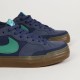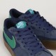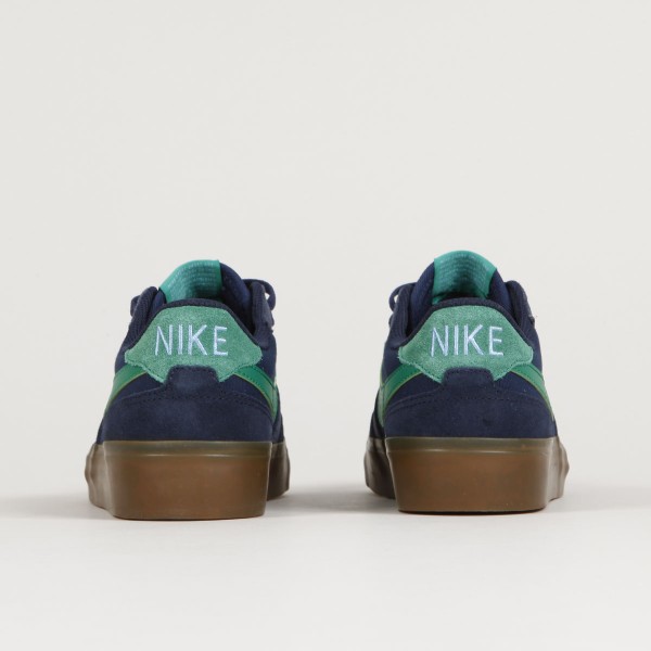 Nike Skateboarding shoes , new Pogo Plus model in Midnight Navy Malachite colorway with brown Gum sole. Upper made of a combination of suede and reinforced canvas, layered quilted toe, vulc brown sole with a classic herringbone pattern and a raised edge on the toe. Inside the shoe with a Zoom Air system under the heel for shock absorption and greater comfort. Iconic swoosh on the side of the shoe and toe. The Nike SB logo is embossed on the heel. Nike logo signature on the tongue and insole.