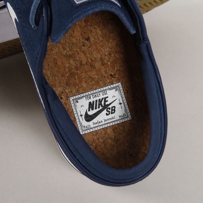 The Nike SB Original Plus Janoski with leather laces is back in a limited Quickstrike edition. The Stefan Janoski OG Plus Pro model in a classic Navy White colorway. Low-cut suede upper, ventilation eyelets on the toe and a classic vulcanized sole with a tree pattern. The tongue features a Nike Skateboarding patch and an embroidered Nike logo on the side. Inside, a cork sockliner with a Zoom Air unit for shock absorption. Also included are spare sockliners and round laces.