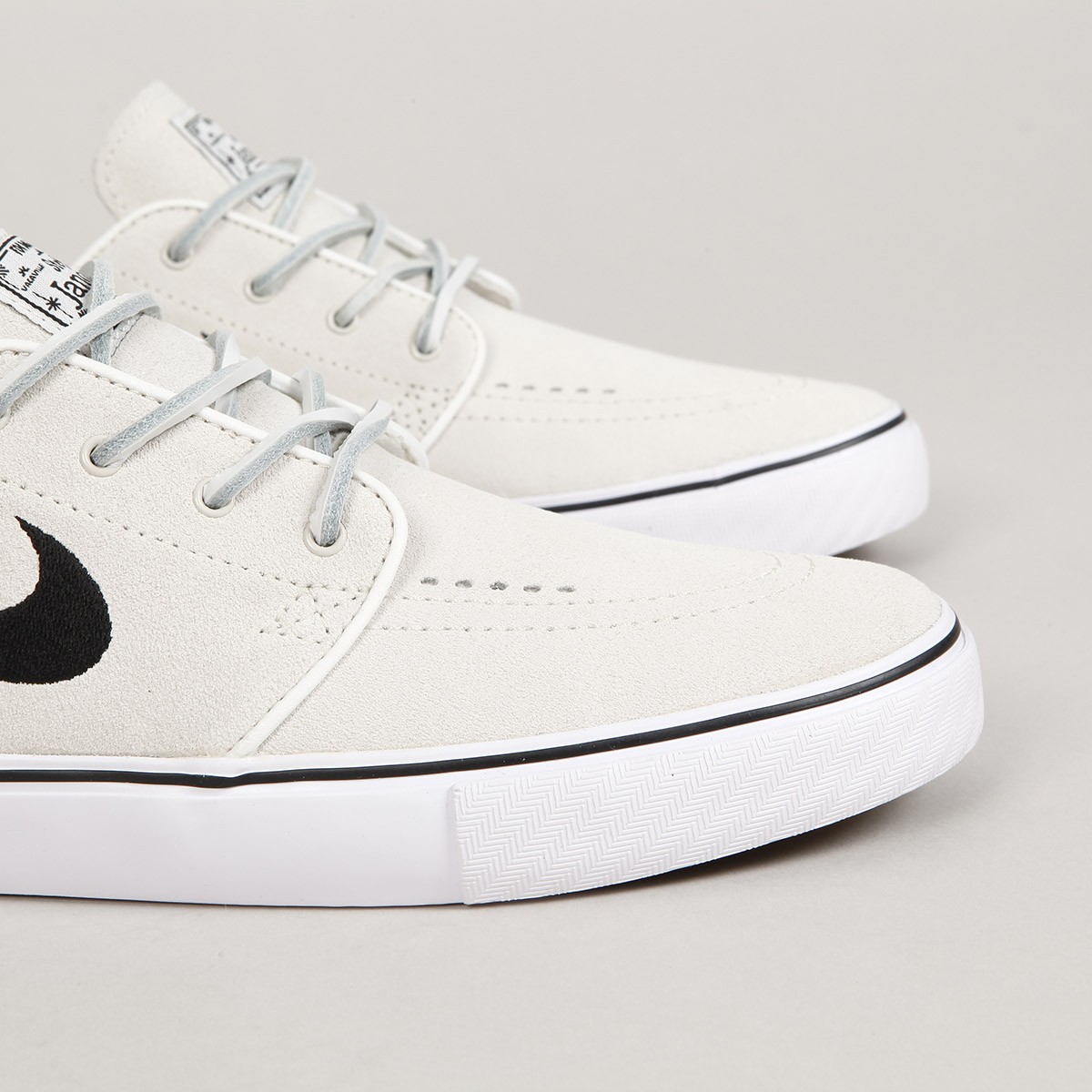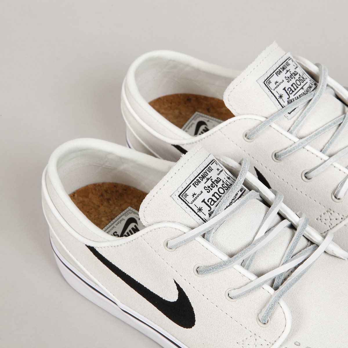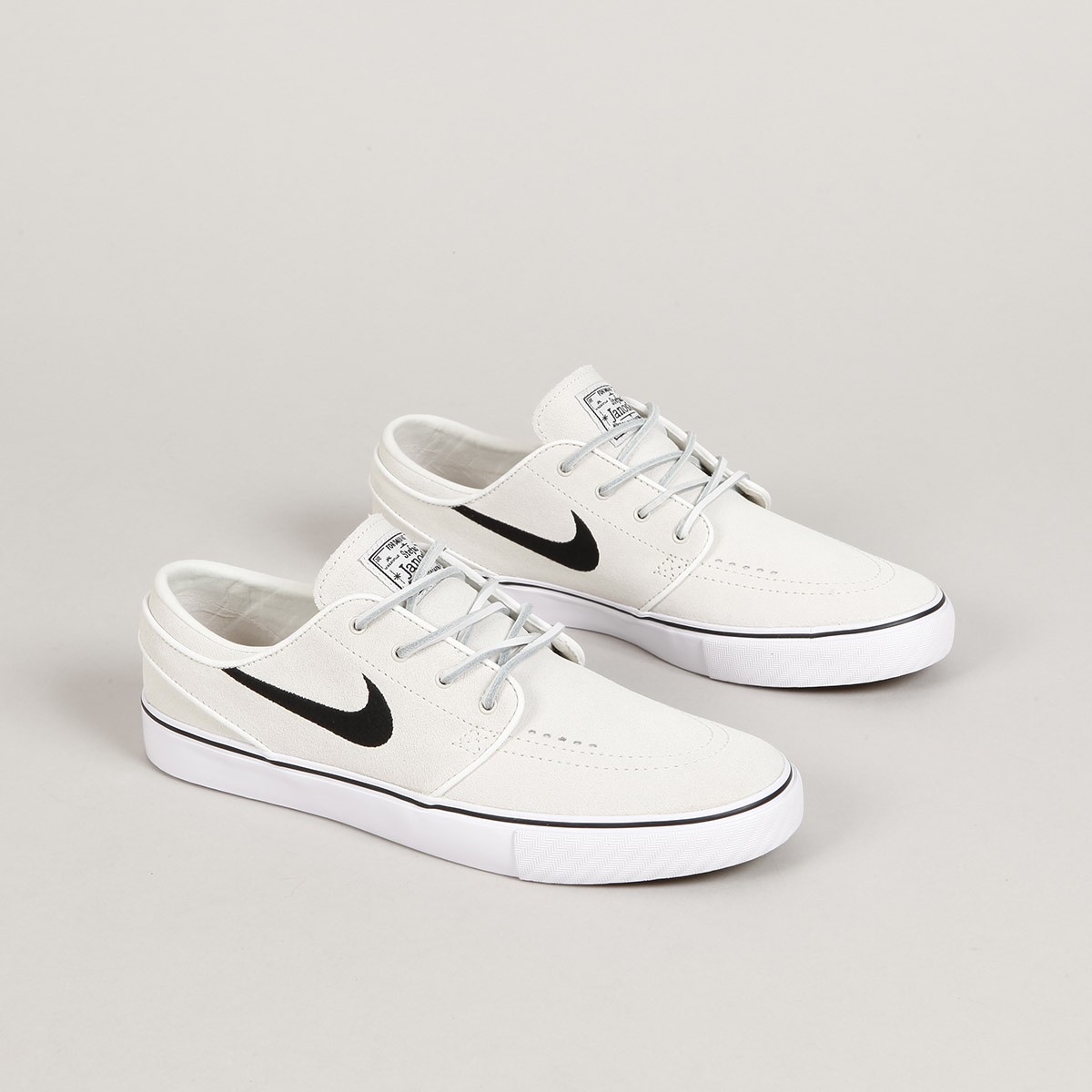 The Nike SB Original Plus Janoski with leather laces is back in a limited Quickstrike edition. The Stefan Janoski OG Plus Pro model comes in a classic Summit White Black colorway. Low-top suede upper, ventilation eyelets on the toe, and a classic vulcanized sole with a tree-like pattern. The tongue features a Nike Skateboarding patch and the Nike logo is embroidered on the side. Inside, there is a cork sockliner with a Zoom Air unit for shock absorption. The package also includes spare sockliners and round laces.