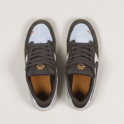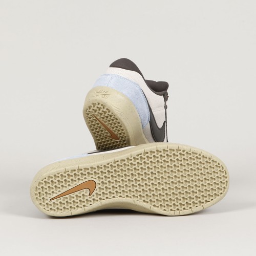 Nike Skateboarding shoes , new Force 58 model in Light Orewood Brown/ Medium Ash - Psychic Blue colorway. They are inspired by basketball shoes. Upper made of suede and canvas, perforated toe for better breathability, outsole combines the durability of Cupsole and the flexibility of vulcanized construction. Tri-Star pattern disperses pressure when stepped on and thus adheres better to surfaces. Iconic swoosh on the side of the shoe and toe. Nike SB logo embossed on the heel. Nike logo signature on the tongue and insole.