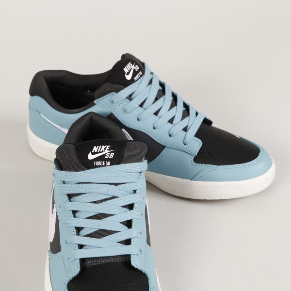 Nike Skateboarding shoes , the new Force 58 model in premium leather and Denim Turq Pink Foam color. They are inspired by basketball shoes. The upper is made of smooth leather, perforated toe for better breathability, the sole combines the durability of Cupsole and the flexibility of vulcanized construction. The Tri-Star pattern disperses pressure when you step on it and thus adheres better to surfaces. The iconic swoosh is on the side of the shoe and toe. The Nike SB logo is embossed on the heel. Nike logo signature on the tongue and insole.