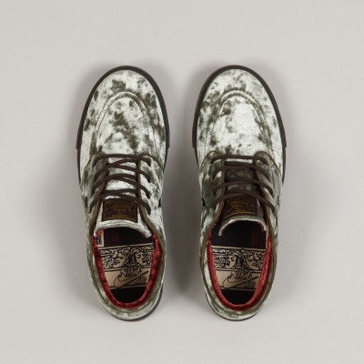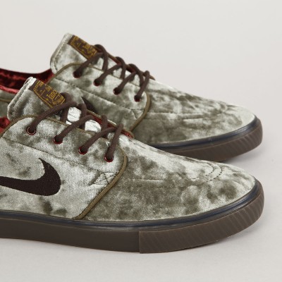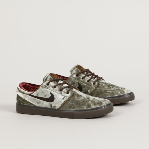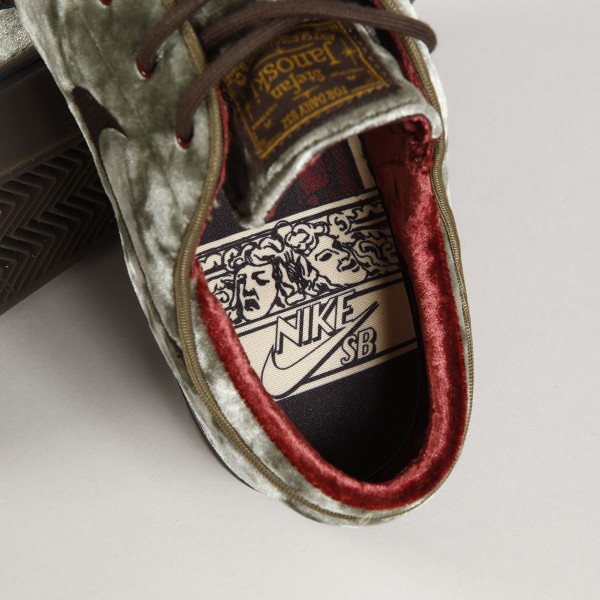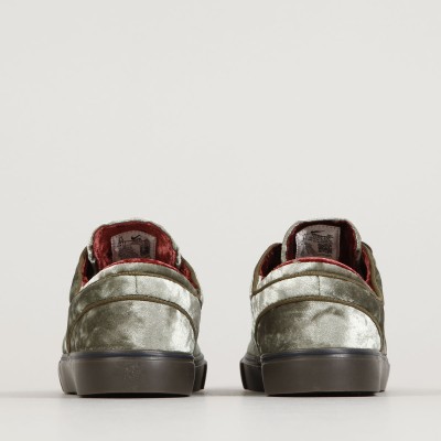 The Nike SB Original Plus Janoski SE round-lace shoes are back in a limited Quickstrike version. They are part of the "City of Cinema" pack, which also includes the Dunk model. The design is inspired by Parisian cinema. The velvet upper refers to classic velvet ropes and seats. Promodel Stefan Janoski OG Plus in the colorway Medium Olive Velvet. Reworked upper made of soft velvet and classic Vulc sole with a tree pattern. There is a Nike Skateboarding patch on the tongue and an embroidered Nike whistle on the side. Inside the sock with a Zoom Air cushioning unit with a theater stage and curtain graphic.