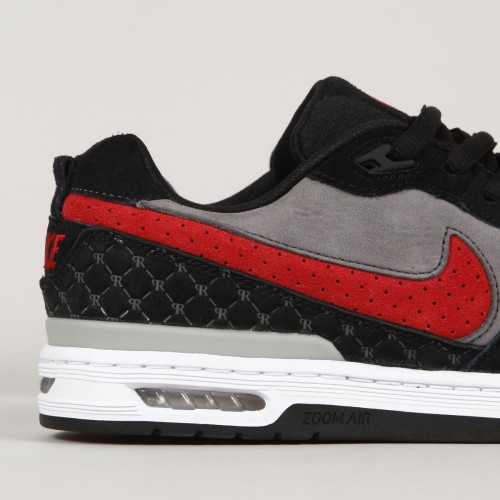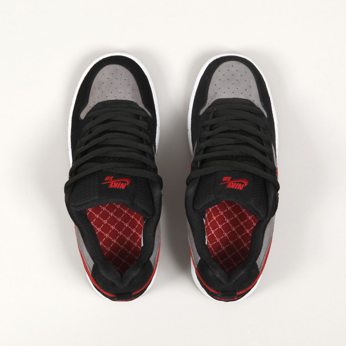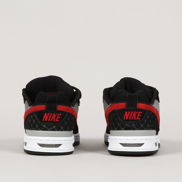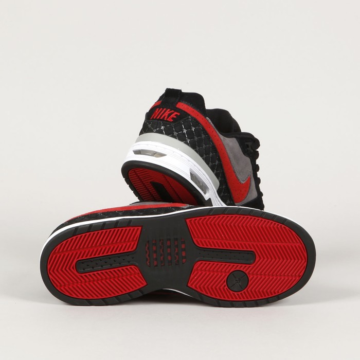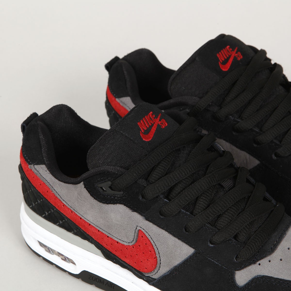 The Nike SB Zoom Air P-Rod 1 Low shoe model in Black/ Varsity Red - Flint Grey - Black. As the first Nike SB signature athlete with more than a dozen signature shoes in his collection, Paul Rodriguez and his 20-year career with Nike embodies professionalism and determination. To celebrate this milestone, Nike is releasing a faithful copy of his original signature shoe, the P-Rod 1 Zoom Air Low in the original "Bred" colorway from 2005. A low-cut suede silhouette with a mesh tongue and Nike SB logo, sidewall with embossed P-Rod pattern, which can also be found on the heel. It has a round perforated toe, cupsole construction and a sole with an added carbon plate and bubble for impact absorption. A tongue gusset ensures a perfectly fitting cut, which guarantees excellent contact with the board and its control. Textile tongue with Nike SB logo and padded ankle collar for greater comfort, patterned fabric swoosh on the side. Plastic upper eyelet for laces and a loop on the heel for easier putting on. Contrasting Nike SB logo embroidered on the tongue, Nike lettering on the heel. The insole has a P-Rod logo graphic. The whole pays homage to the first P-Rod model.
