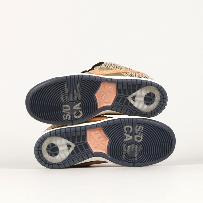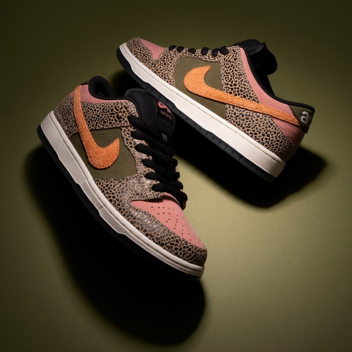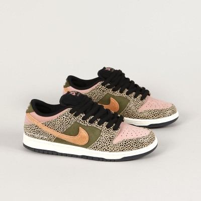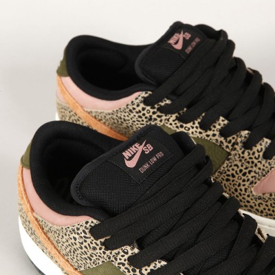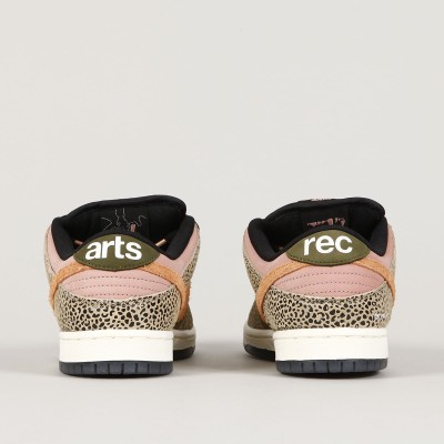 Nike SB Dunk Low Pro in collaboration with Arts-Rec Skateshop in Khaki/ Amber Brown-Rough Green-Rust Pink. San Diego is nicknamed "The City on the Move", with its mix of cultures and people from different backgrounds and beautifil weather. A paradise for skateboarding since its inception. In 2018, skater Kellen James created the Arts-Rec skateshop. The shop is based on the duality of skateboarding in its two locations. Ot offers a carefully selected assortment and community events that reflects the creative spirit of San Diego. The colorway is inspired by the scenery, wildlife and energy of the San Diego Zoo, located in Balboa Park. The modern look reflects the colors of nostalgia with soft shades and animal motifs. From the first step, it fives a well-trodden impression. The low top version features a soft, shiny leather upper with a perforated toe, a lightweight, semi-tanslucent cupsole with a Zoom Air cushioning unit. A tongue gusset provides a snug fit for excellent board contact and control. Thick textile tongue with Nike SB logo and padded ankle collar for comfort, contrasting suede swoosh on the side. Nike SB label on the tongue, Arts-Rec embossed on the heel. The insole features a fraphic of animal fur and Nike SB x Arts-Rec. Comes with colorful laces.