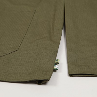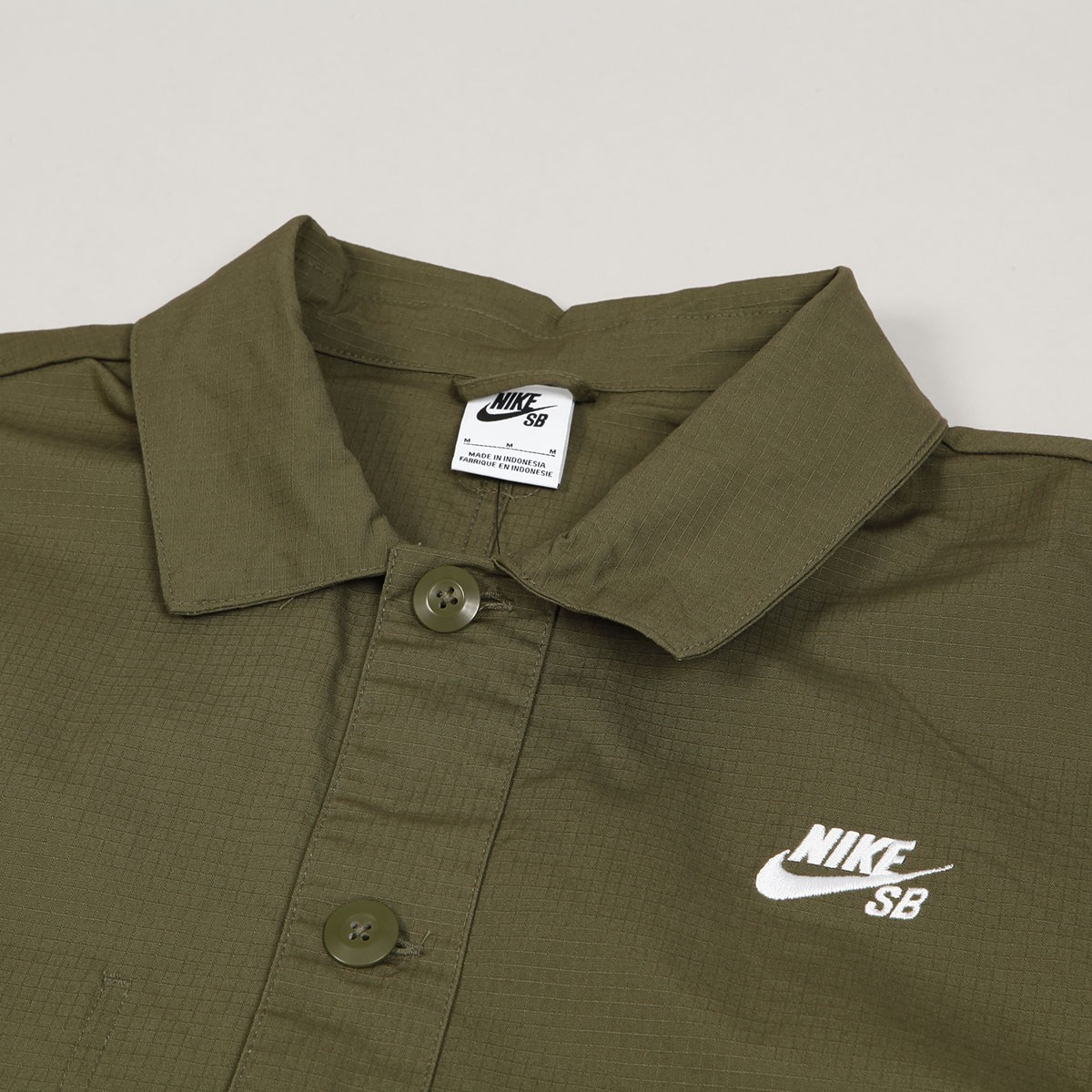 Nike SB Federation Agnostic Icon Logo Coach Jacket in olive green with a collar and button fastening. It is made of 100% polyester, which is breathable and water-repellent. Two hand pockets in the front. Small Nike SB logo embroidered on the left chest. Subtle brand flag on the left hip.