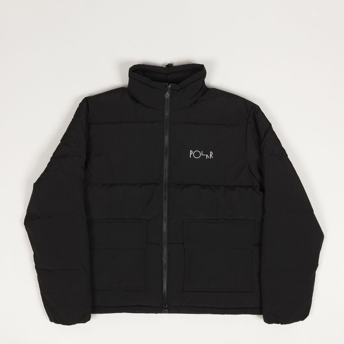 Polar Skate Co. jacket called Pocket Puffer Jacket in black. On the left side of the chest, the inscription POLAR is embroidered in white. Down jacket with a YKK two-way zipper with the Polar logo. Two front pockets with studs and two hidden inner pockets. The collar and waist have a sewn-in elastic band. Filled with RDS-certified down and top protection with natural bio impregnation. Material: upper 100% polyamide, stitching 100% polyester, filling 90/10 duck down.