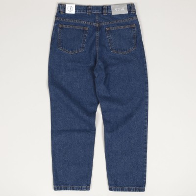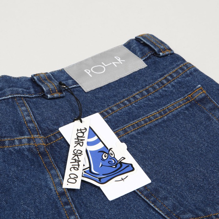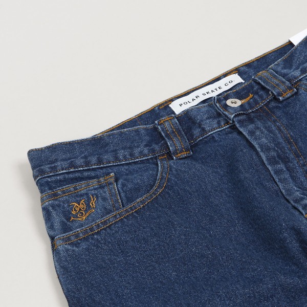 Polar Skate Co. pants called 92 Denim Jeans in dark blue. They have a wider retro cut with tapered legs. They fasten with a covered zipper and button. In the right pocket there is a sticker of a smiley face with a cigarette. Made of 100% cotton, 435 g. Made in Poland.