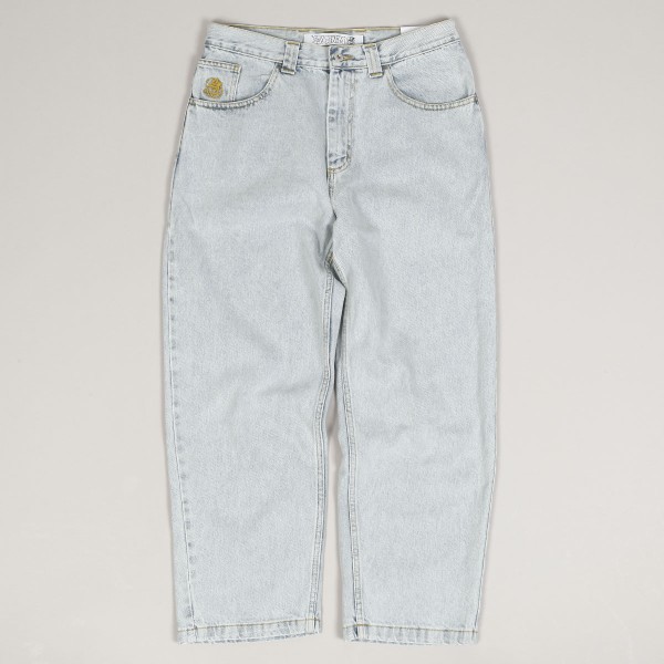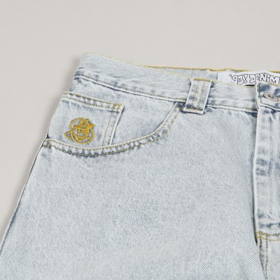 Polar Skate Co. pants called 93 Denim Jeans in light blue color. They have a wider retro cut with straight legs. They fasten with a covered zipper and button. Patch in the right pocket. Made of 100% cotton, 435 g. Made in Poland.