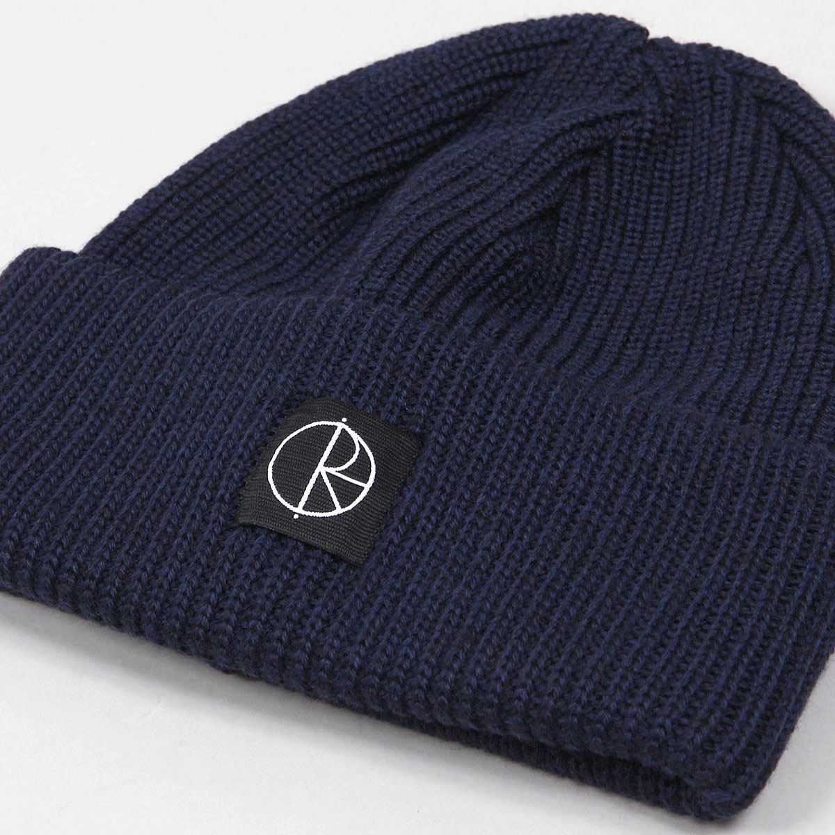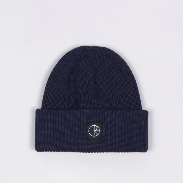 Double Fold Merino Beanie in dark blue from POLAR Skate Co. The material is made of 100% Merino wool, which is very soft, comfortable and warm. There is a small patch with the Polar logo on the front.