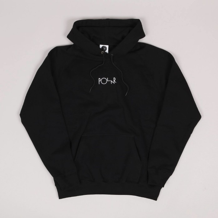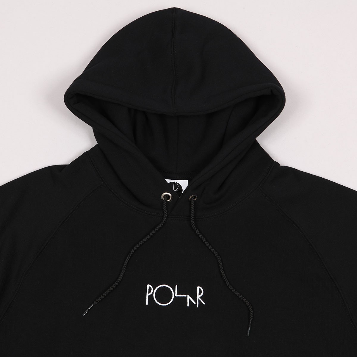 Polar Skate Co. Default Hoodie in black. Drawstring hood and large hand pocket on the front. Smaller POLAR inscription in white embroidered on the chest. Material 70% cotton and 30% polyester, 310 g, finely brushed inside. Made in Portugal.