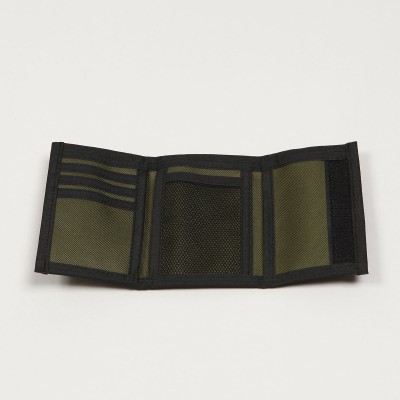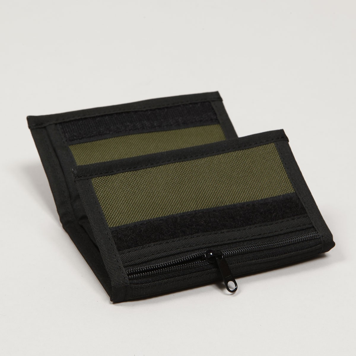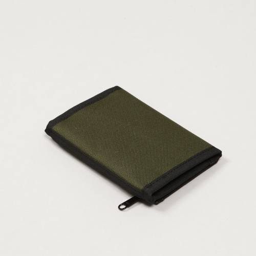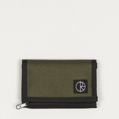 Wallet from Polar Skate Co. called Stroke Logo Key Wallet in a combination of dark green and black. On top there is a subtle Polar Stroke logo patch in contrasting white . Inside there is a card slot, a key loop, a large pocket for banknotes and a smaller pocket for coins with a zipper. The wallet is made of durable Cordura fabric, it is waterproof, the material is 100% polyester. Dimensions approximately 13 x 9 centimeters.