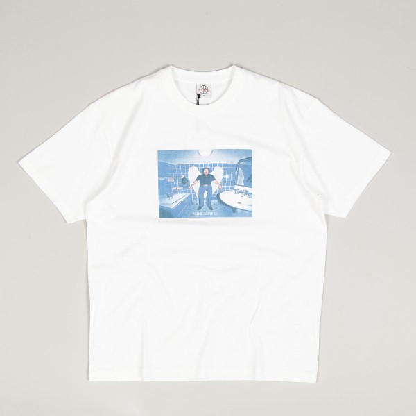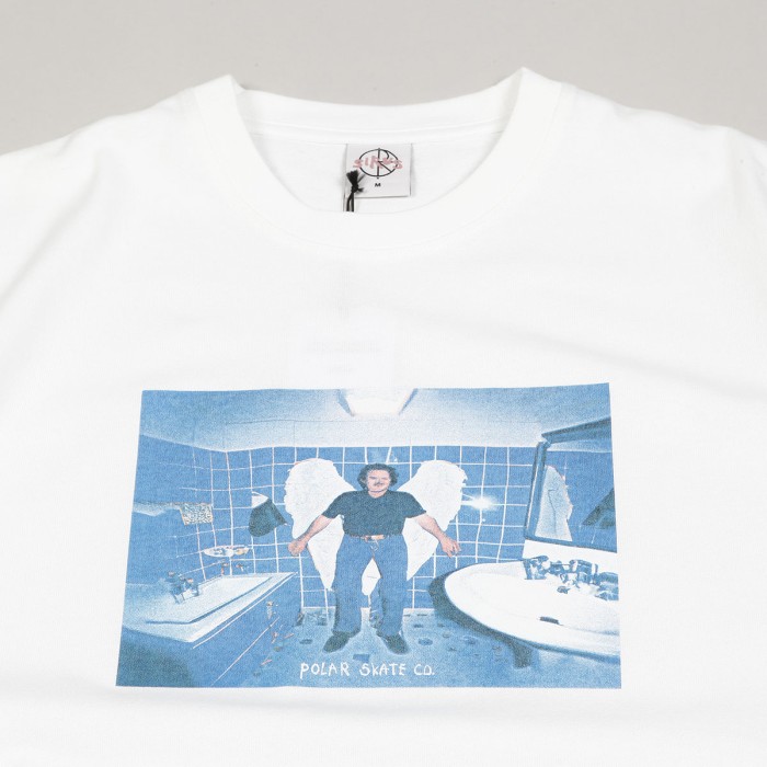 Polar Skate Co. Angel Man Tee in white. Classic Regular Fit cut with slightly dropped shoulders and ribbed collar at the neck. On the chest there is a graphic of a photo of a man with angel wings in a bathroom with the inscription Polar Skate Co. The motif was created by Sirius F Gahan. Made of 100% cotton, 220 gsm.