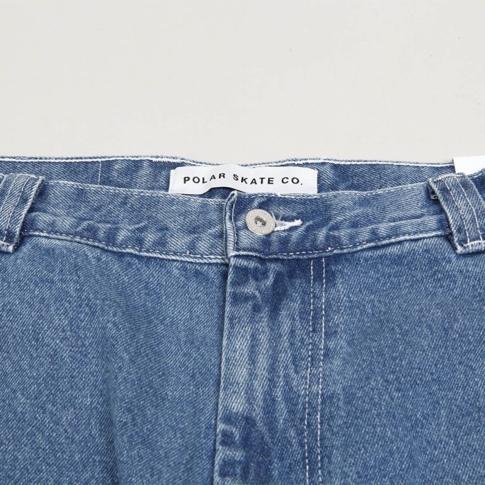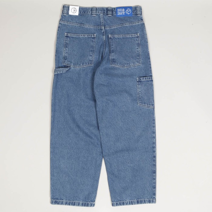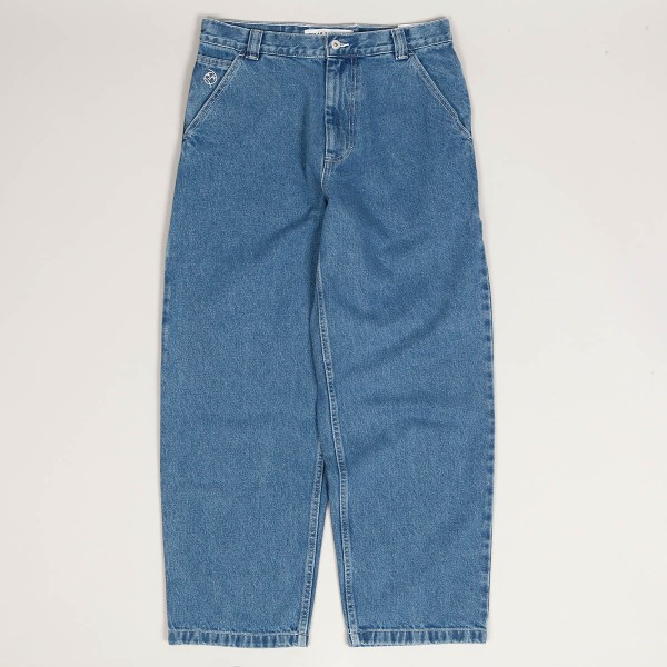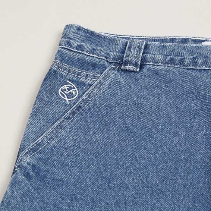 Polar Skate Co. pants called Big Boy Work Pants in washed blue. They have a wide retro cut with wide legs. On the right leg there is a small drop in the knee area and on the left thigh there is a retro loop. They fasten with a covered zipper and button. In the right pocket there is a smiley face patch. Made of 100% cotton, 435 g. Made in Poland.