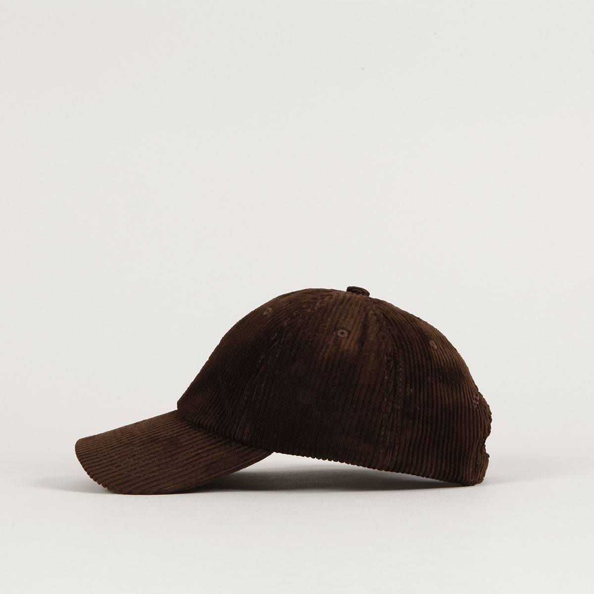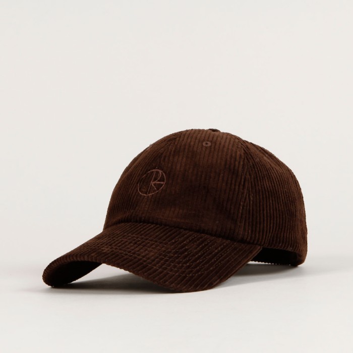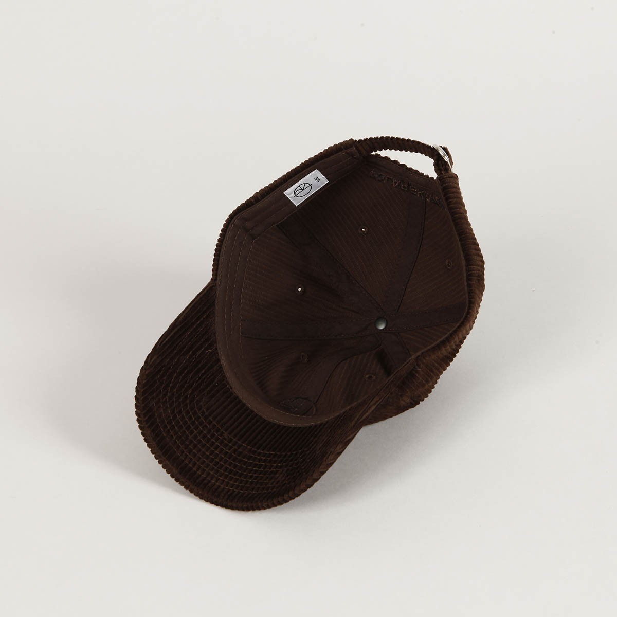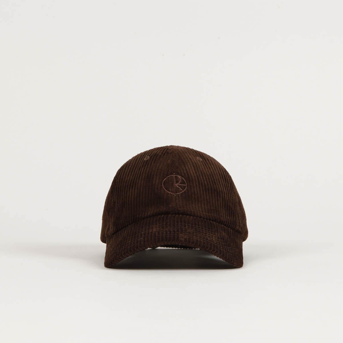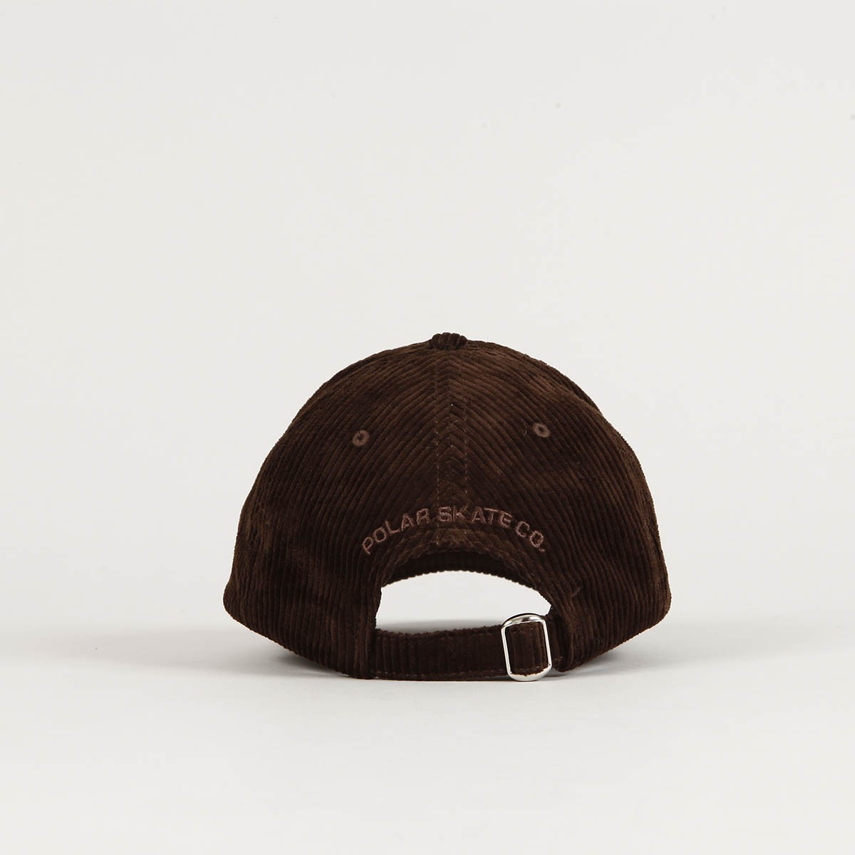 Sai Cord Cap in dark brown from POLAR Skate Co. Classic baseball cut, 6 panels with a curved peak in corduroy. Each panel has a ventilation eyelet. The Polar logo is embroidered on the forehead. There is a fabric strap with a metal buckle at the back for size adjustment.