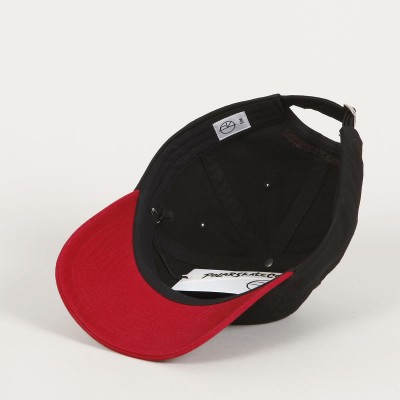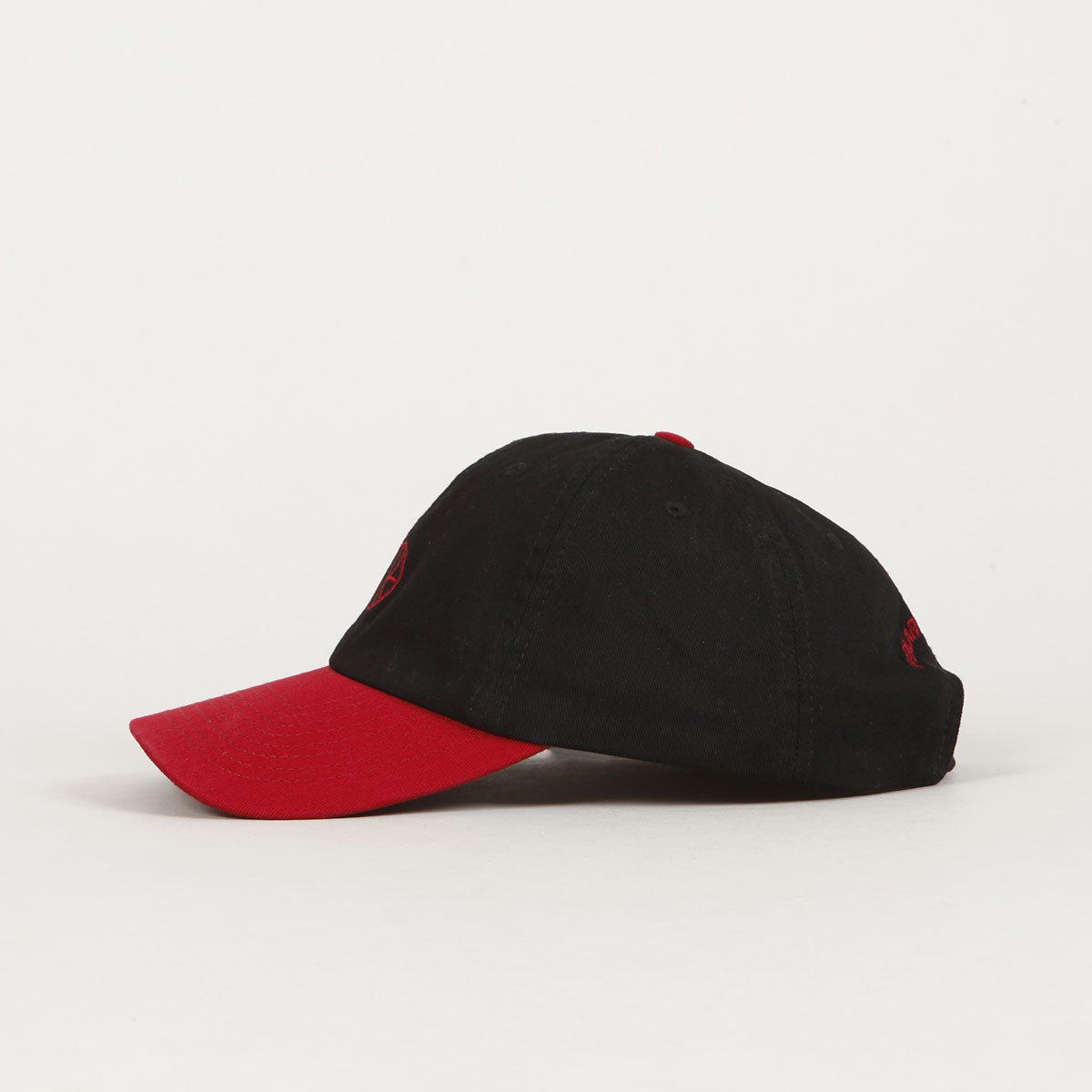Sai Stroke Logo Cap in black with a red peak from POLAR Skate Co. Classic baseball cut, 6 panels with a curved peak. Each panel has a ventilation eyelet. The contrasting Polar logo is embroidered on the front and the Polar Skate Co inscription on the back. There is a fabric strap with a metal buckle on the back for size adjustment. The cap is offered in two sizes, the difference is in the depth of the cap.