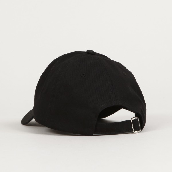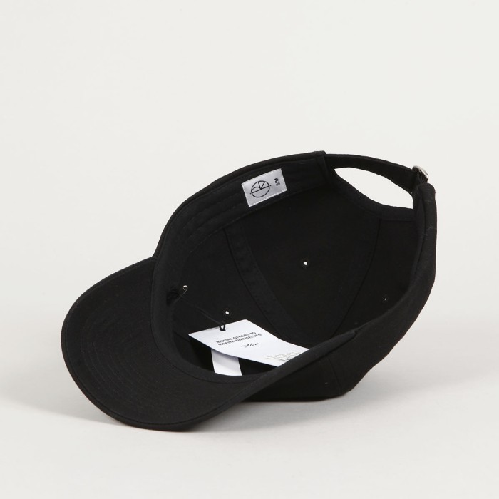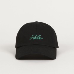 Sai Varsity Logo Cap in black from POLAR Skate Co. Classic 6-panel baseball cut with a curved peak. Each panel has a ventilation eyelet. The Polar logo is embroidered on the forehead. There is a fabric strap with a metal buckle at the back for size adjustment. The cap is offered in two sizes, the difference is in the depth of the cap.