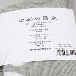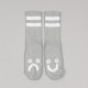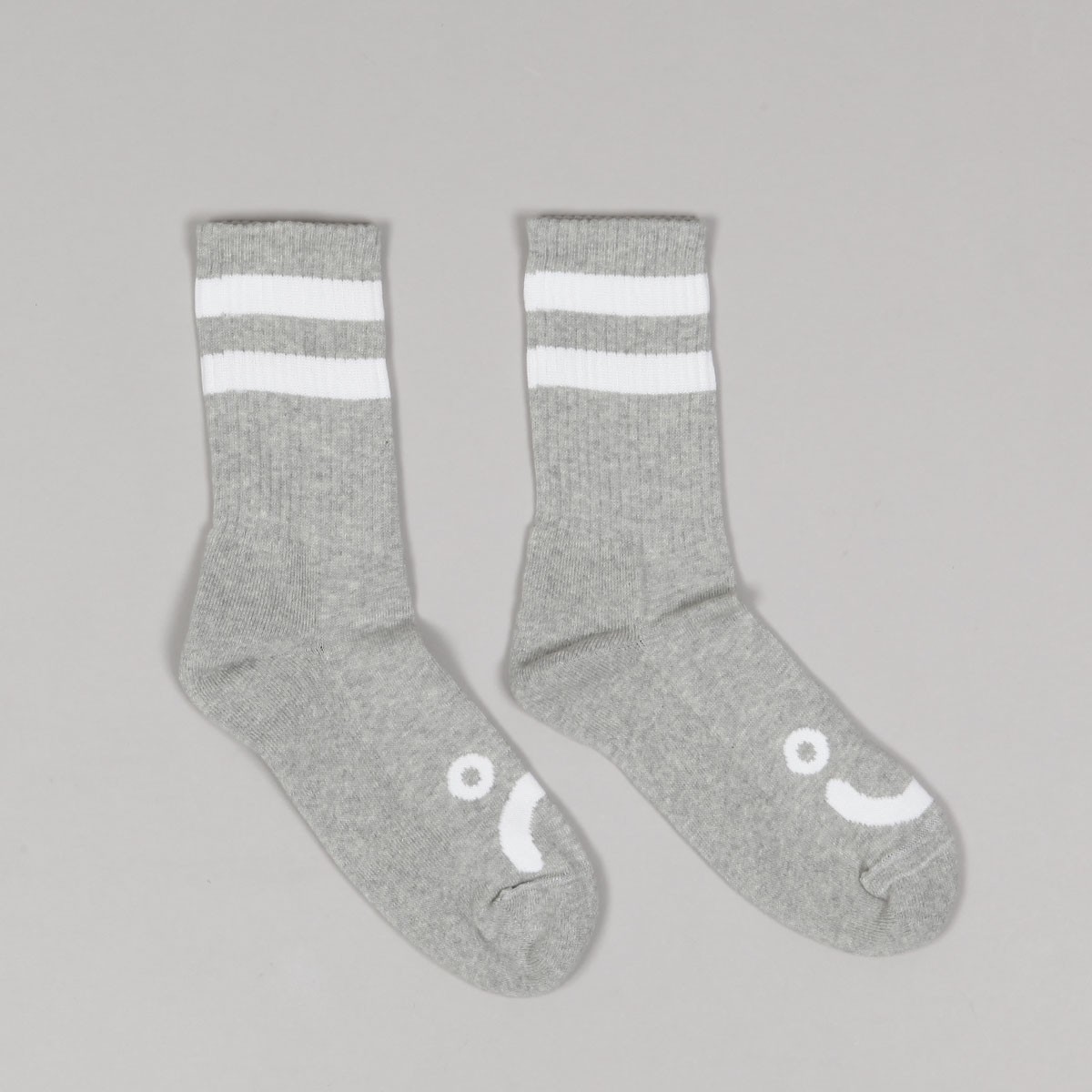 Socks from Polar Skate Co. called Happy Sad Classic Socks in gray. Two white stripes on top and original Happy x Sad graphic on the toes. Material 85% cotton, 10% polyester, 5% spandex. #happysadaroundtheworld