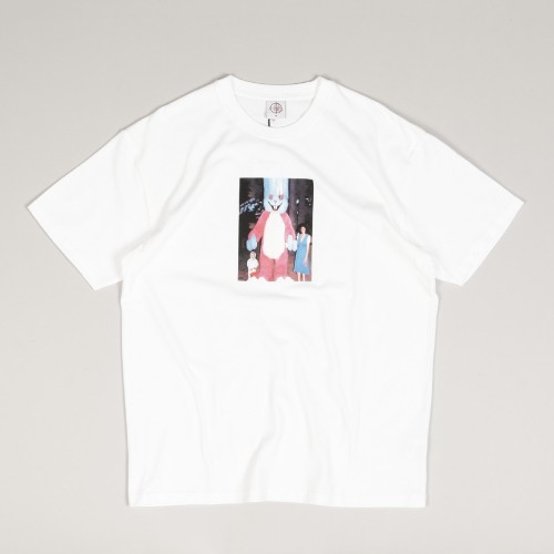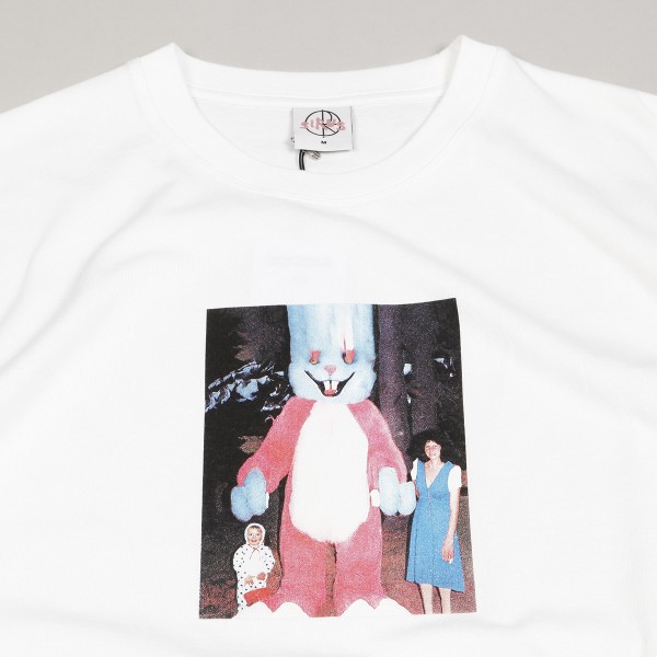 Polar Skate Co. Bunny Tee in white. Classic Regular Fit cut with slightly dropped shoulders and ribbed collar at the neck. On the chest there is a graphic of a photo with a pink bunny. Made of 100% cotton, 240 gsm.
