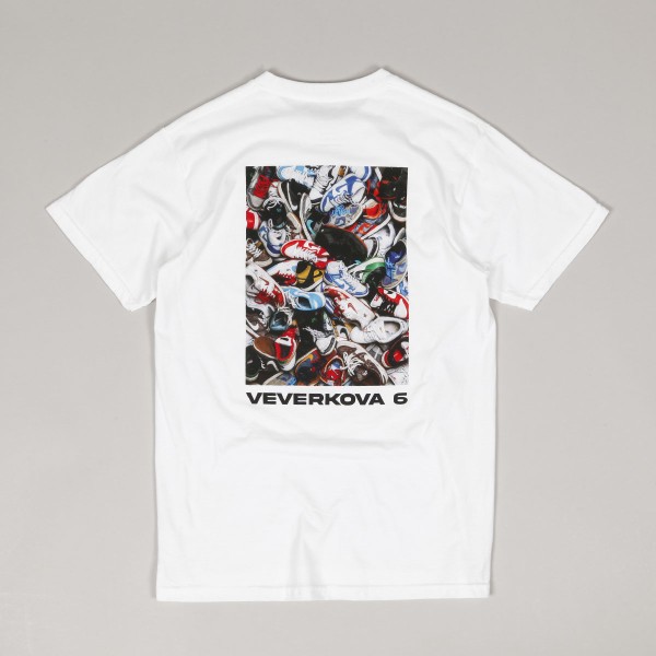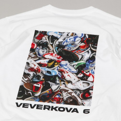 White T-shirt with short sleeves and POPNAME Box logo print on the chest. Large color print with skate Dunks motif on the back. Under the graphic, the inscription Veverkova 6. The T-shirt is made of very comfortable combed and reinforced 100% cotton with a weight of 203 g/m 2 and double stitching on the hems. The cut is unisex with a regular fit.
