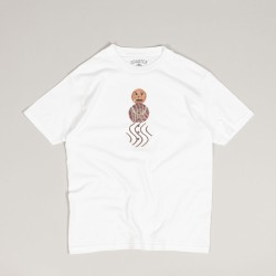 Quartersnack T-shirt called Front Snackman Tee in white. On the chest there is a print of Snackman made of various snacks. The motif resembles a snowman. Behind the neck there is a contrasting Quartersnacks logo. Material 100% cotton.