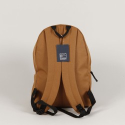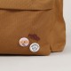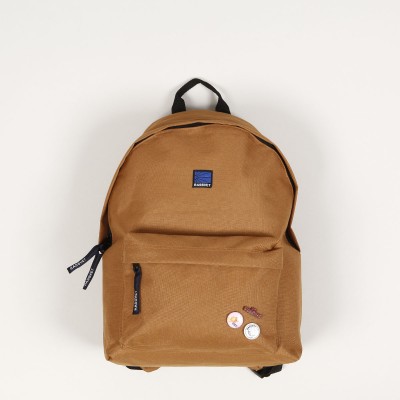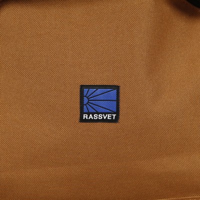 Rassvet backpack called Pin Woven Backpack in caramel brown. It has a pleasantly padded back and shoulder straps, a large pocket and a smaller one in the front for small items. Both pockets with YKK zipper closure with the brand logo. In the middle of the front of the backpack there is a patch with the Rassvet logo. On the front flap there are three pins that can be unfastened and pinned elsewhere. Dimensions approx. 42x32x23 centimeters. Material 100% polyester. Made in France.