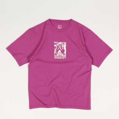 Rassvet T-shirt called Captek Tee in magenta. On the chest there is a print of a picture resembling Mickey Mouse with the inscription Rassvet. Classic cut with a ribbed, round collar and short sleeves. Material 100% cotton. Made in Turkey.