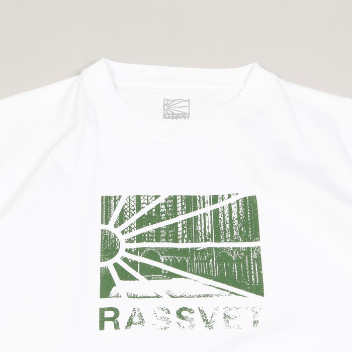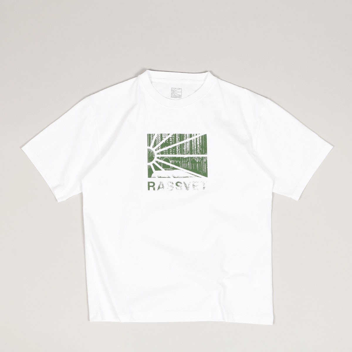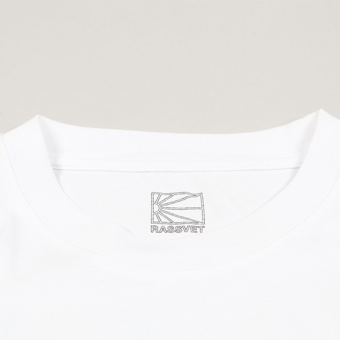 Rassvet T-shirt called Ray Logo Tee in white. Logo print with Rassvet inscription on the chest. Classic cut with ribbed, round collar and short sleeves. Material 100% cotton. Made in Turkey.