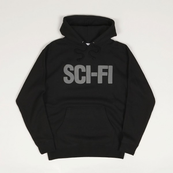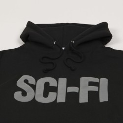 Sci-Fi Fantasy sweatshirt called Big Logo Hoodie in black. It has tapered ribbed sleeves and waist, hood with drawstring. Large kangaroo pocket on the stomach. Large, raised, contrasting Sci-Fi lettering graphic on the chest. Made of cotton and polyester with a higher weight.