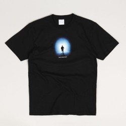 Sci-Fi Fantasy T-shirt called The Keep Tee in black. It has a round collar and short sleeves. On the chest there is a graphic of a character running after the light with a small contrasting Sci-Fi Fantasy inscription. Made of heavy cotton.