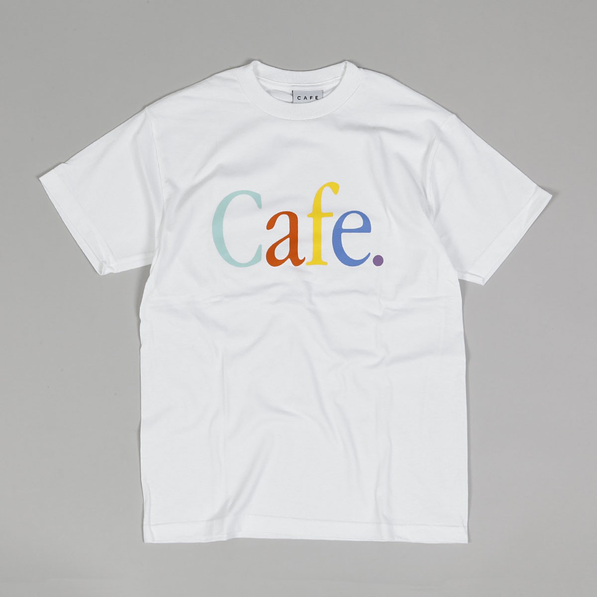 T-shirt from the British brand Skateboard Cafe , which was created together with the skateboard video of the same name in 2008. Wayne Tee model in white, with a colorful Cafe inscription printed on the chest. Material 100% cotton.