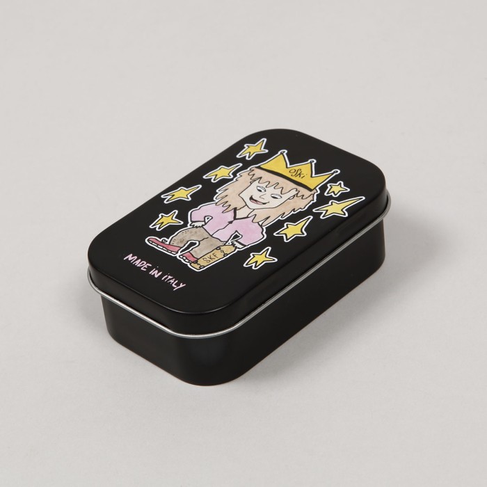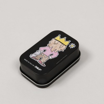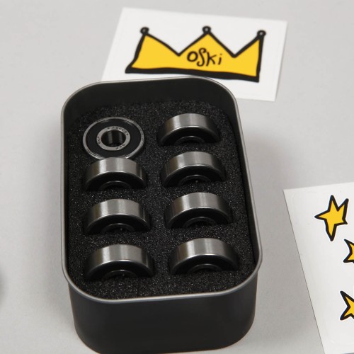 SKF Bearings called Oski Pro. This is a pro model of the young Swedish rider Oskar "Oski" Rozenberg. They combine speed, smooth running and high durability. They have a removable rubber cover on one side for easy cleaning. They are made in Italy. The package contains 8 bearings, several SKF and Oski stickers. Everything is packed in a metal box with painted Oski graphics. This was created by Stockholm artist and skater David Stenström.