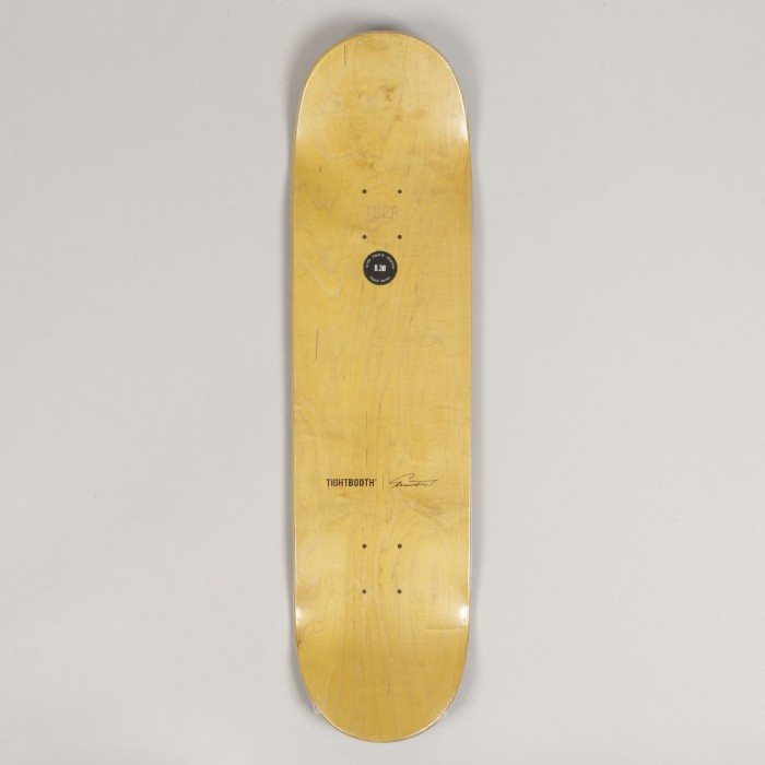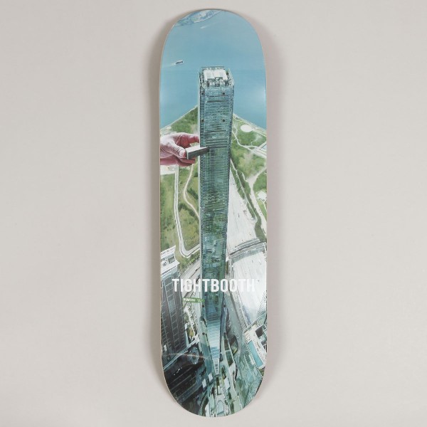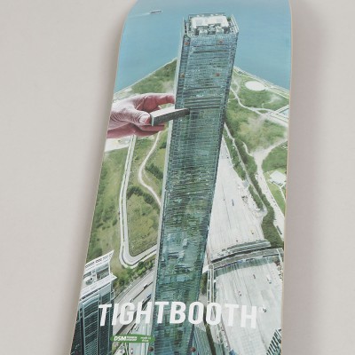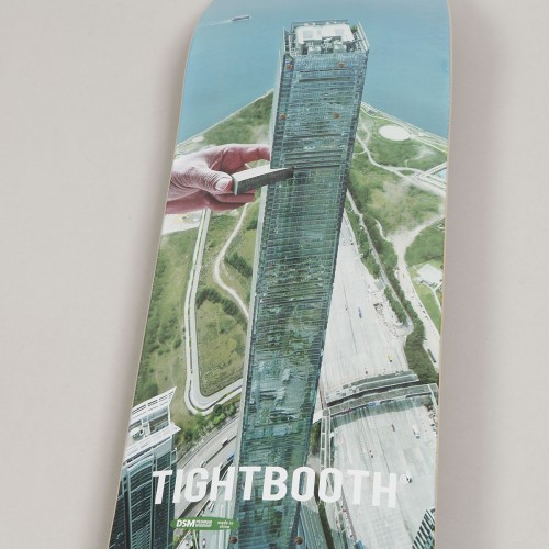 Skateboard from the Japanese brand Tightbooth Skateboards, founded in 2005 by Shinpei Ueno. Model called Jenga Deck in size 8.38 inches. Graphics of a photo of a skyscraper modified into the shape of a tower from the game Jenga. Tightbooth inscription on the bottom of the board. Free grip with each board.