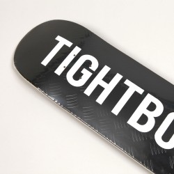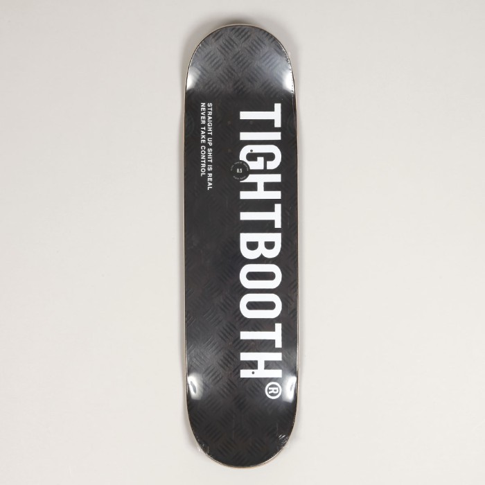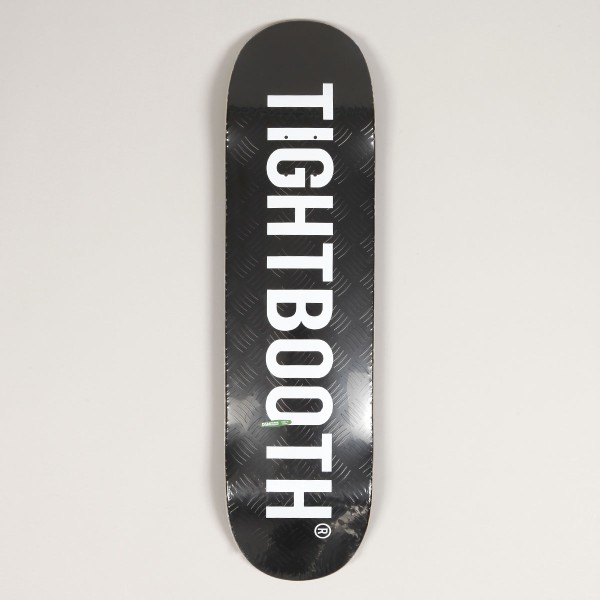 Skateboard from the Japanese brand Tightbooth Skateboards, founded in 2005 by Shinpei Ueno. Model called CP Logo Black Deck in size 8.5 inches. Double-sided graphics of contrasting Tightbooth lettering on a background of 3D embossed ribbed metal. Free grip with each board.