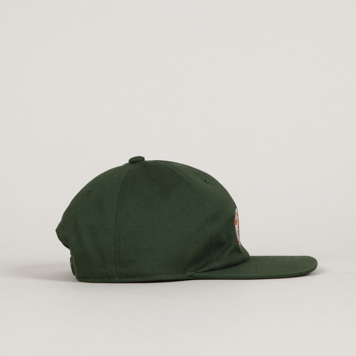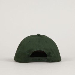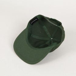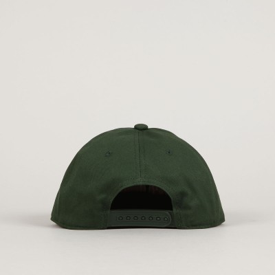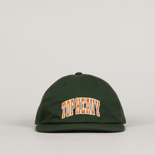 Top Heavy cap called Double Take 6 Panel Forest with a straight peak in green. Contrasting Top Heavy logo embroidered on the forehead. Adjustable plastic strap at the back for size adjustment. Ventilation eyelets on each panel. Universal size, fits most. Made of cotton.