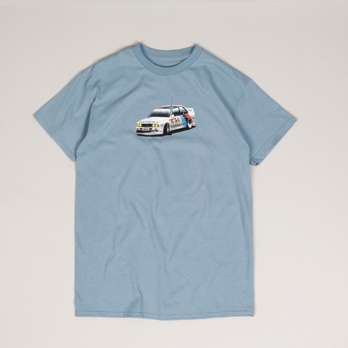 Top Heavy T-shirt called Beam Tee in blue-gray color. On the chest there is a print of a racing BMW M3 E30 with a Top Heavy sticker. Made of 100% cotton.
