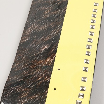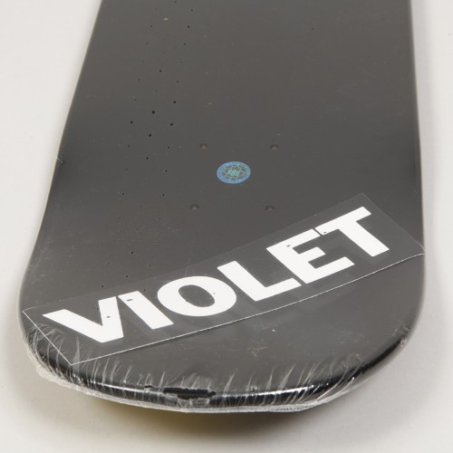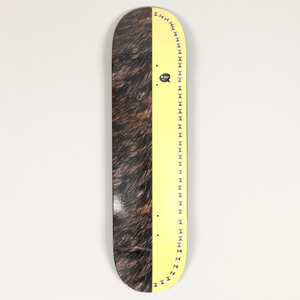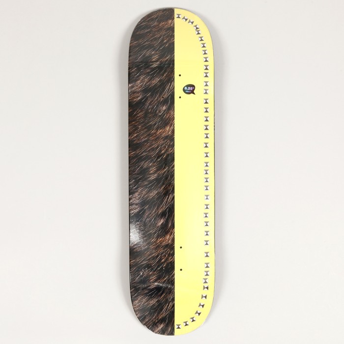 Violet Skateboards Studded Banana Bear Deck. Half-length graphic of a bear fur and banana with metal pyramids. Graphic by Seven Strong. Size 8.25 inches. Top of the deck dipped in a black paint bath. Free grip with each deck.